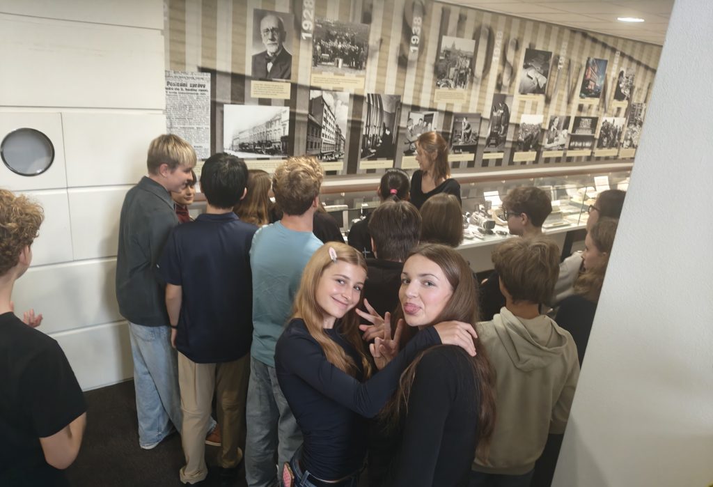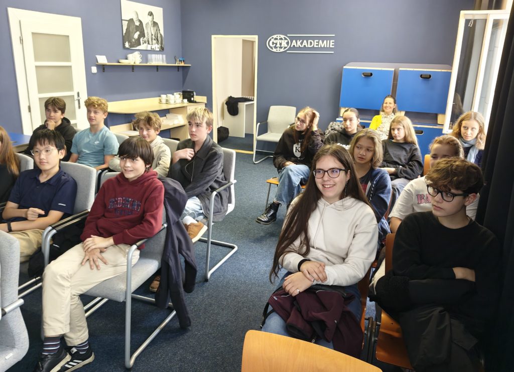 2. V úterý 7. 10. 2025 jsme se třídou byli v ČTK na komentované prohlídce. Paní průvodkyně byla velice milá, téma bylo zajímavé, a dokonce jsme se mohli podívat přímo do kanceláří mezi pracující zaměstnance. Paní průvodkyně mluvila o historii ČTK, popisovala, jak funguje ČTK, jak rychle jsou schopní odesílat aktuální informace.