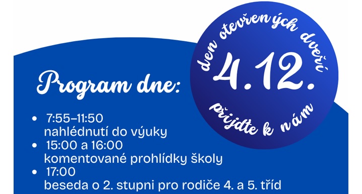 Ve čtvrtek 4. prosince se koná v naší škole Den otevřených dveří. Zveme všechny zájemce o zápis do 1. ročníku