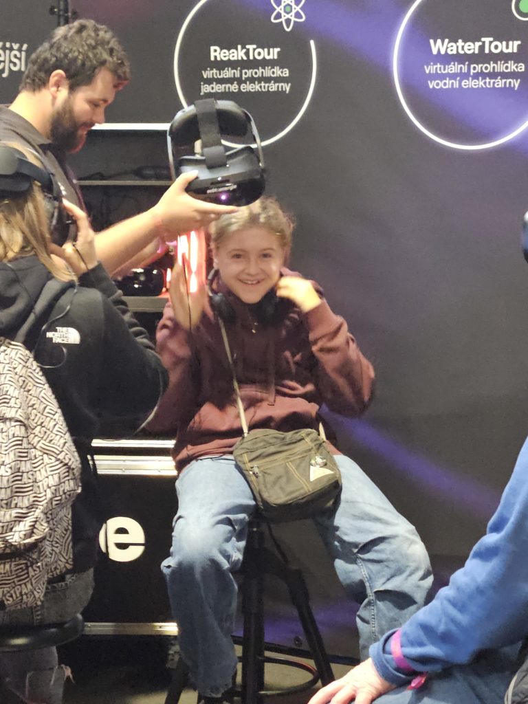 Několik dětí se navíc nechalo unést virtuální realitou, která zprostředkovala fascinující cestu elektřiny z českých elektráren až do našich zásuvek.