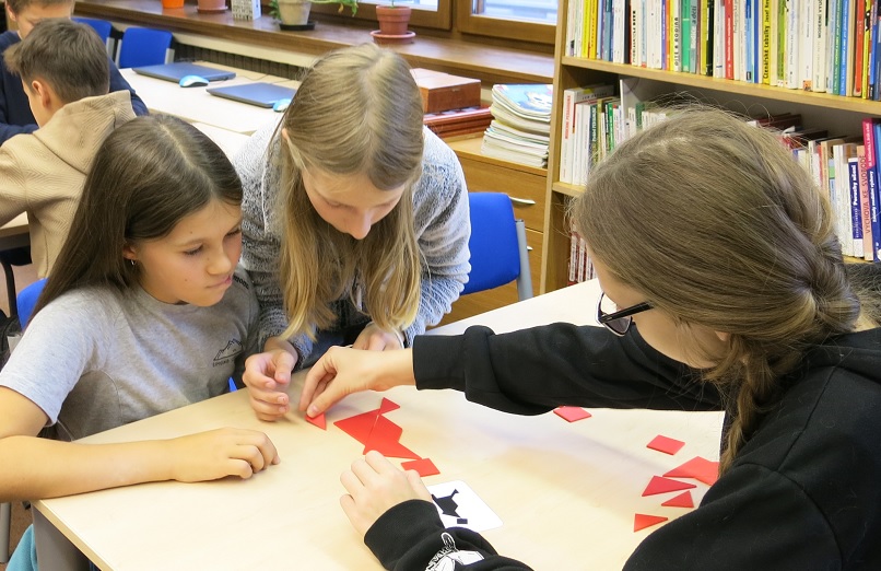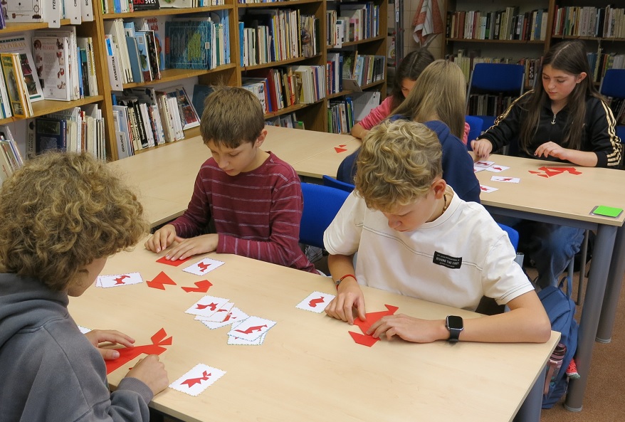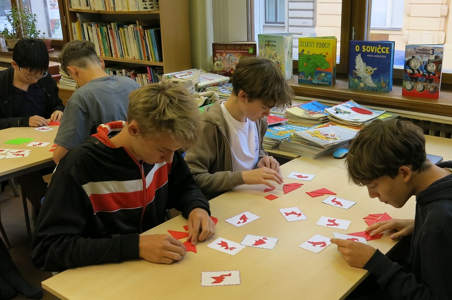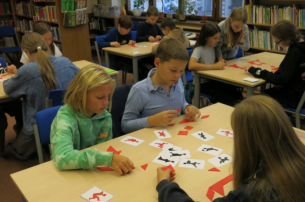 Ve čtvrtek 2. 10. 2025 proběhla tradiční školní soutěž Tangramiáda 2025. Ve školní knihovně se nejprve sešlo osm tříčlenných týmů z pátých a šestých tříd a pak osm týmů ze sedmých a osmých tříd, aby poměřily své dovednosti ve skládání tangramu – geometrického hlavolamu. Soutěžící měli za úkol sestavit obrazce zpodobňující zvířata, předměty a postavy podle předloh ze sedmi dílků tangramu, a to v časovém limitu.