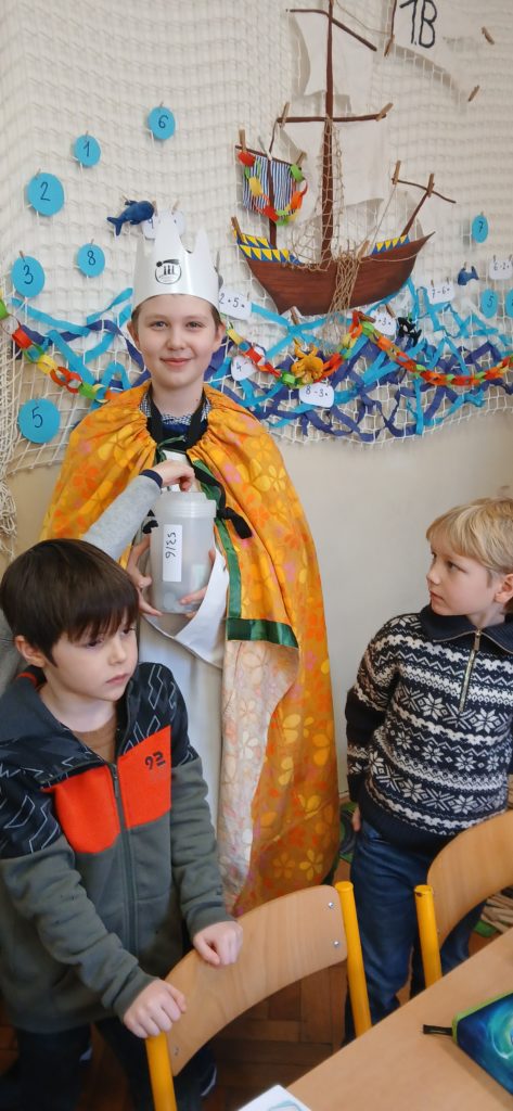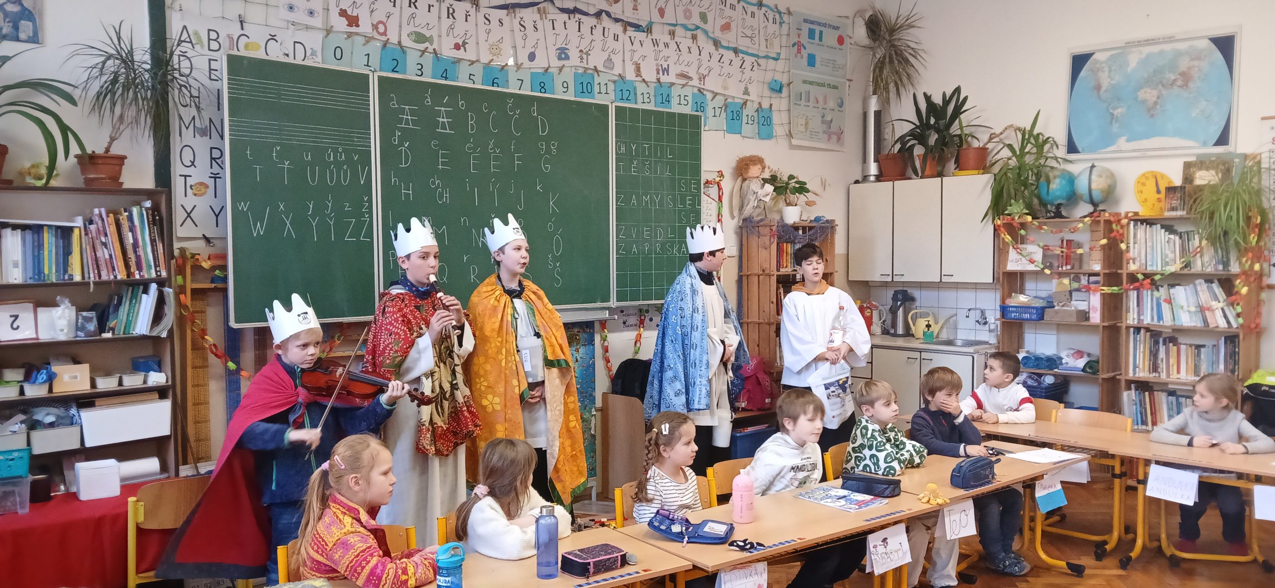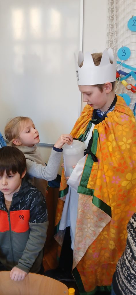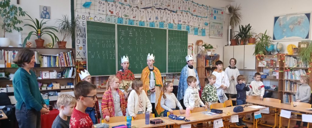 V úterý 6. ledna po školní mši sv. přišli do naší školy králové od sv. Voršily. Mudrci (tentokrát 4) se svým zpěvem a hrou na hudební nástroje snažili potěšit žáky i učitele, ministranti provonět dýmem kadidla každý záhyb školní budovy. Ani množství svěcené vody, ani dary pro potřebné v rámci „Tříkrálové sbírky“, ani opakovaná slova modlitby by nám příliš nepomohla, kdybychom se sami nesnažili vnímat svou důstojnost Božích dětí (princezen a princů, královen a králů) a připomínat sobě i druhým, že jsem Bohem milováni. K Betlému, do královské rodiny, jsme pozváni všichni a ani nemusíme mít korunu ze zlata nebo papíru na hlavě. Děkuji všem královnám i králům naší školy.